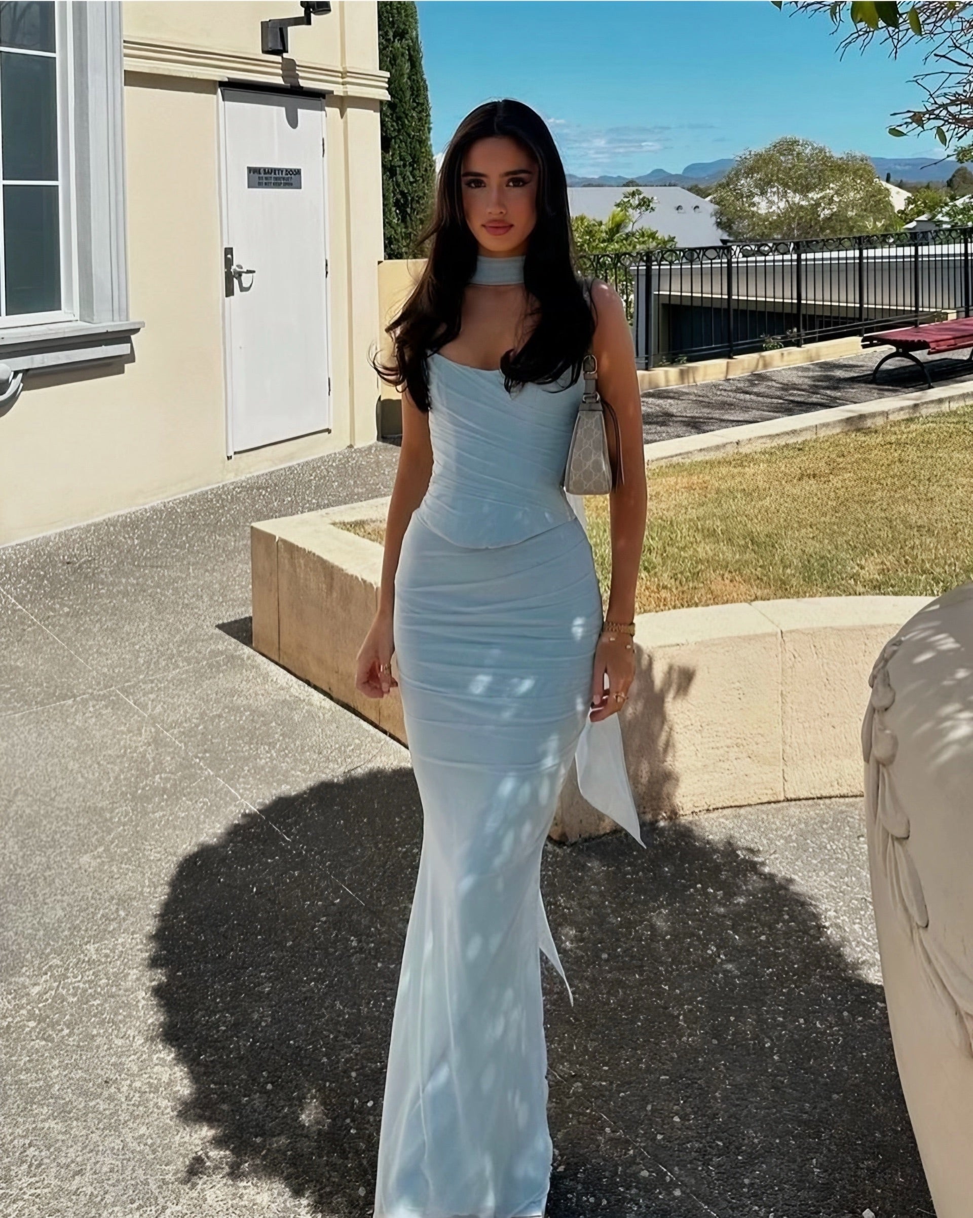 This set is crafted from stretch mesh for maximum comfort. It features a strapless bodice that cinches the waist, while also adding a touch of femininity with its delicate neckline and neck scarf. The skirt is gently gathered and hugs the figure, with a mid-rise waist and side zip for easy on.