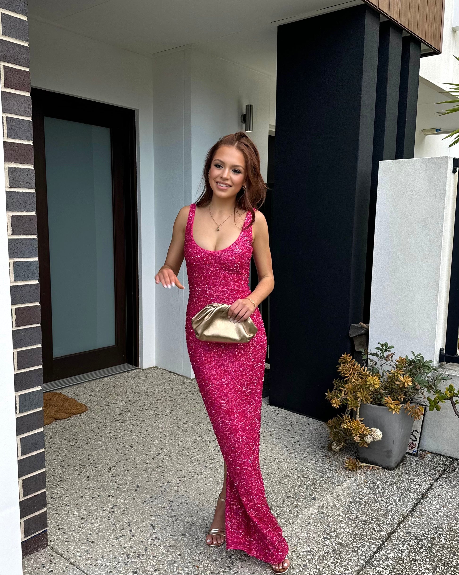 The Janhvi maxi features hot pink sequin embellishments throughout and a centre back split. This maxi is fully lined, but is slightly sheer and is finished with a hidden back zipper closure.